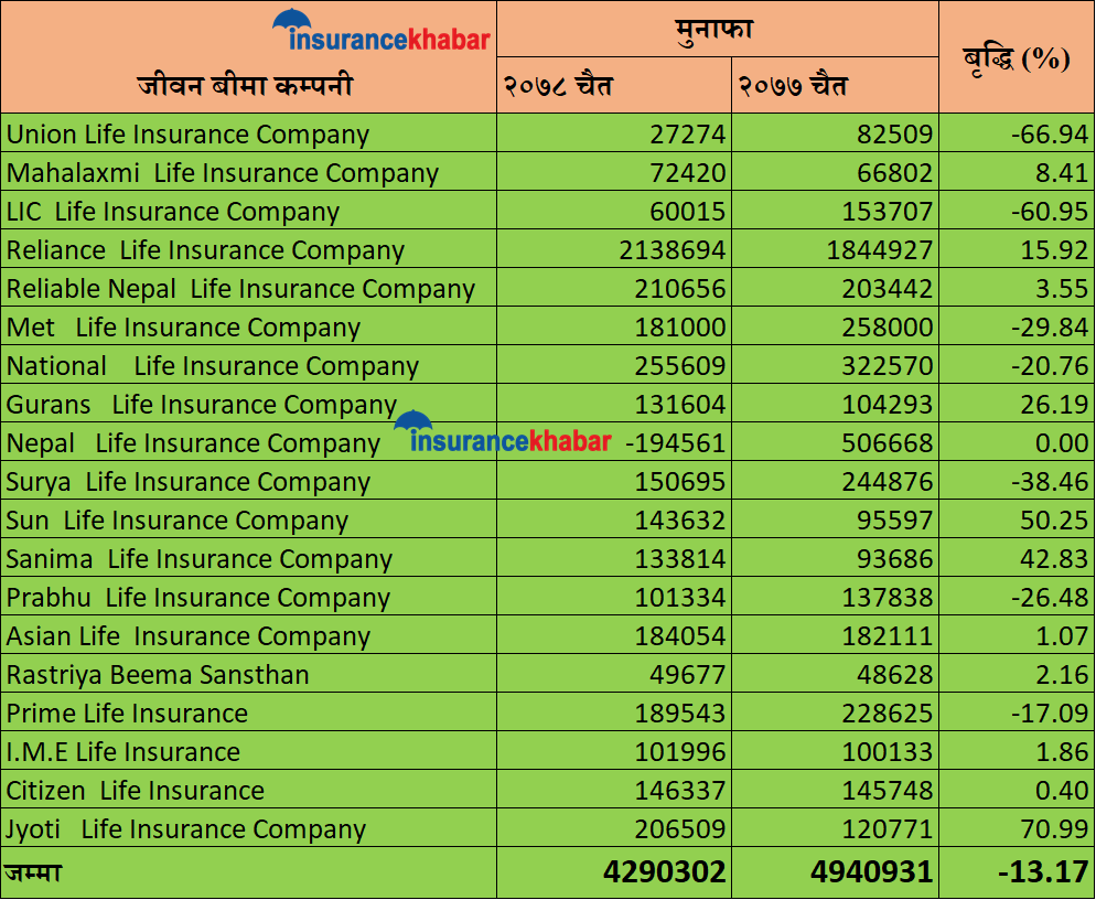 तेस्रो त्रैमाशिक अवधिमा जीवन बीमा कम्पनीले ४ अर्ब २९ करोड रुपैयाँ मुनाफा आर्जन गरेका छन् । गत वर्षको यहि अवधिमा कम्पनीको मुनाफा ४ अर्ब ९४ करोड रुपैयाँ थियो । यस वर्ष सर्वाधिक धेरै ज्योति लाइफको मुनाफा ७० प्रतिशतले सुधार भएको छ । कम्पनीले तेस्रो त्रैमाशिक अवधिमा २० करोड ६५ लाख रुपैयाँ मुनाफा आर्जन गरेको छ ।