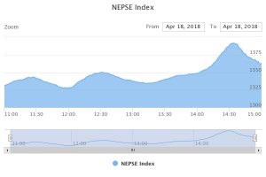 काठमाडौं, वैशाख ५ । बुधबार शेयर बजार परिसुचक नेप्से उच्च अंकले बढेको छ । परिसुचक वृद्धि भएसँगै आज कारोबार रकम पनि अर्ब नाघेको छ । आज १६५ कम्पनीको १ अर्ब १२ करोड ६७ लाख १६ हजार १७ रुपैयाँको शेयर किनबेच भएको छ ।