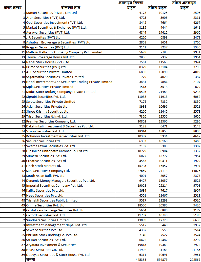 सबैभन्दा धेरै सक्रिय अनलाइन प्रयोगकर्ता नासा सेक्युरिटिजमा रहेका छन्। नासामा २१ हजार १८५ जना सक्रिय अनलाइन प्रयोगकर्ता छन्। त्यस्तै दोस्रोमा सनि सेक्युरिटिजको १४ हजार ७६ जना सक्रिय अनलाइन प्रयोगकर्ता छन्। सबैभन्दा कम सक्रिय अनलाइन प्रयोगकर्ता सगरमाथा सेक्युरिटिजमा ३८७ जना मात्रै छन्।