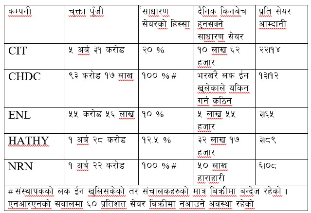 नोटः प्रस्तुत आँकडाहरु कम्पनीहरुले प्रकाशित गरेका त्रैमासिक वित्तीय विवरण, बार्षिक प्रतिवेदन र नेपाल स्टक एक्सचेन्जको वेबसाइटमा आधारित छन्। लगानी गर्नुअघि आफैँले तथ्यहरुको जाँच गरी कसैको बहकाउ र प्रभावमा नपरी निर्णय गर्नु अपरिहार्य छ।