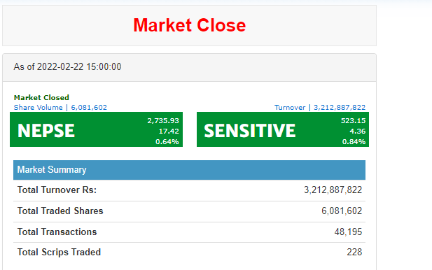 मैलुङ खोला र युनाइटेड इदि मर्दीको शेयर मूल्य सर्वाधिक धेरै बढ्ने क्रममा सकारात्मक सर्किट लागेको छ । सबैभन्दा धेरै सिभिल लघुवित्त वित्तीय संस्थाको शेयर मूल्यमा गिरावट देखिएको छ । नेपाल टेलिकमको सबैभन्दा धेरै कारोबार भएको छ ।
