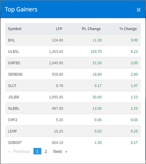 आज सबैभन्दा धेरै बलेफी हाइड्रोपावरको शेयरमूल्य बढेको छ । आजैदेखि कारोबार सुरु भएको बलेफीको शेयर मूल्य ११ रुपैयाँले बढेर १२४ रुपैयाँ पुगेको छ । त्यस्तै उपकार लघुवित्त वित्तीय संस्थाको शेयर मूल्य पनि ८.२३ प्रतिशतले सुधार भएको छ । गणपती लघुवित्त वित्तीय संस्थाको शेयर मूल्य ३.०९ प्रतिशतले बढेर १०४९ रुपैयाँ कायम भएको छ । त्यस्तै जनउत्थान र नेरुडेको मात्रै शेयर मूल्यमा सुधार भएको छ ।