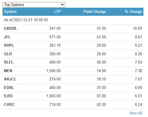 मंगलबार ग्रिन लाइफ हाइड्रोपावरको ८.२६ प्रतिशत, रिलायन्स फाइनान्स ७.९३ प्रतिशत, माउन्टेन इनर्जी ७.३८ प्रतिशत, आखुखोला जलविद्युत कम्पनीको ७.०७ प्रतिशत, एक्सल डेभलपमेन्ट बैंकको ६.९० प्रतिशत, इन्फिनिटी लघुवित्त ६.६१ प्रतिशत र सिइडिवी हाइड्रोपावरको ६.२४ प्रतिशतले सुधार भएको छ ।