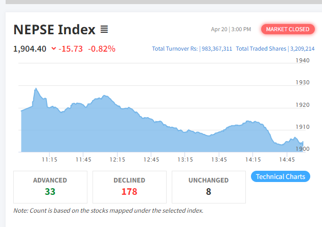 माहोल नै नकारात्मक हुँदा सरकारले जति सुकै बजार सुधारको अपेक्षा गरे पनि बढ्न भने सकेको छैन । आज साताको अन्तिम दिन नेप्से सूचक १५.७३ अंकले घटेर १९०४.४० अंकमा झरेको छ । कारोबार रकम ९८ करोड ३३ लाख रुपैयाँमा सिमित भएको छ ।