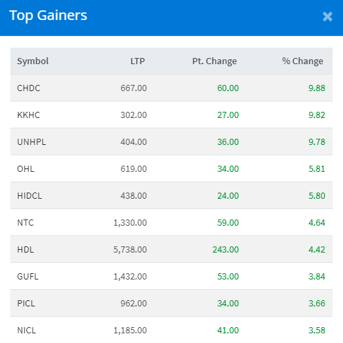 त्यसैगरी आज सबैभन्दा धेरै छ्याङदी हाइड्रोपावर कम्पनीका लगानीकर्ताले ७ दशमलव ६६ प्रतिशतका दरले गुमाएका छन् । लिवर्टि इनर्जी कम्पनीका लगानीकर्ताले ७ दशमलव ०२ प्रतिशतका दरले गुमाएका छन् । बरुण हाइड्रोपावर कम्पनीका लगानीकर्ताले ६ दशमलव ९८ प्रतिशतका दरले गुमाएका छन् ।