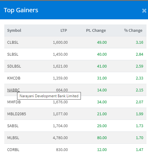 त्यस्तै, आज सिभिल लघुवित्तका लगानीकर्ताहरुले सबैभन्दा धेरै प्रतिशतका दरले कमाएका छन् । कम्पनीका लगानीकर्ताले ३ दशमलव १६ प्रतिशतका दरले कमाएका छन् । सामुदायिक लघुवित्तका लगानीकर्ताले २ दशमलव ८४ प्रतिशतका दरले कमाएका छन् । साधाना लघुवित्तका लगानकिर्ताले २ दशमलव ५९ प्रतिशतका दरले कमाएका छन् ।