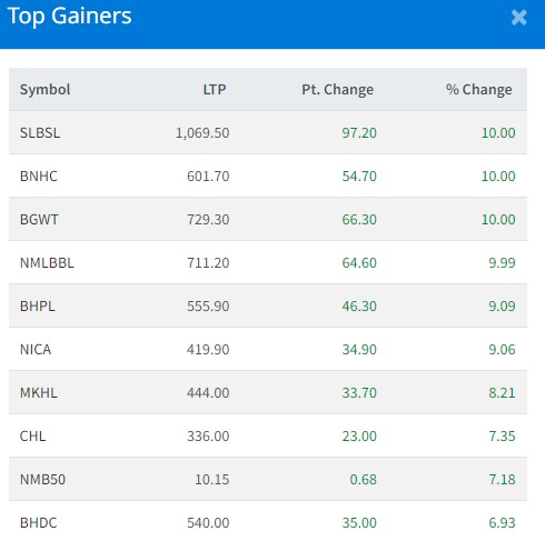 आज सबैभन्दा धेरै सामुदायिक लघुवित्त, बुद्ध भुमि नेपाल लघुवित्त, भगवती हाइड्रोपावर कम्पनीका लगानीकर्ताले कमाएका छन् । आज यी ३ कम्पनीका लगानीकर्ताले १० प्रतिशतका दरले कमाएका छन् । नेरुडे लघुवित्त वित्तीय संस्थाका लगानीकर्ताले ९ दशमलब ९९ प्रतिशतका दरले कमाएका छन् ।