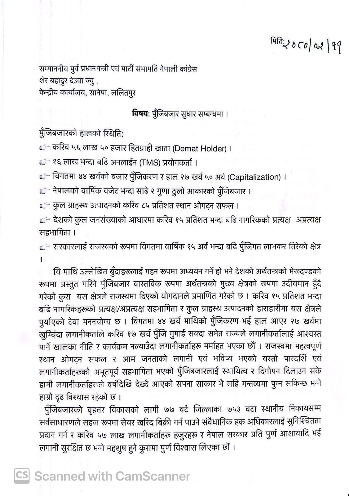काठमाडौं । शेयर बजारको सुधारको माग गर्दै लगानीकर्ता संघ संघठनले नेपाली कांग्रेसका सभापति शेर बहादुर देउवालाई भेट गरेका छन् । लगानीकर्ताले नयाँ ब्रोकर लाइसेन्स, नयाँ स्टक एक्सचेन्ज र कमोडिटी एक्सचेन्जको लाइसेन्स वितरण प्रकृयाँ ढिला सुस्ती नगरि कार्यन्वयन गर्न माग गरेका हुन् । उनिहरुले १२ करोडसम्मको शेयर कर्जाको सिमाले शेयरबजारलाई निरुत्साहित गरेकोले सो व्यवस्थालाई फिर्ता लिनका लागि अनुरोध गरेका छन् ।
