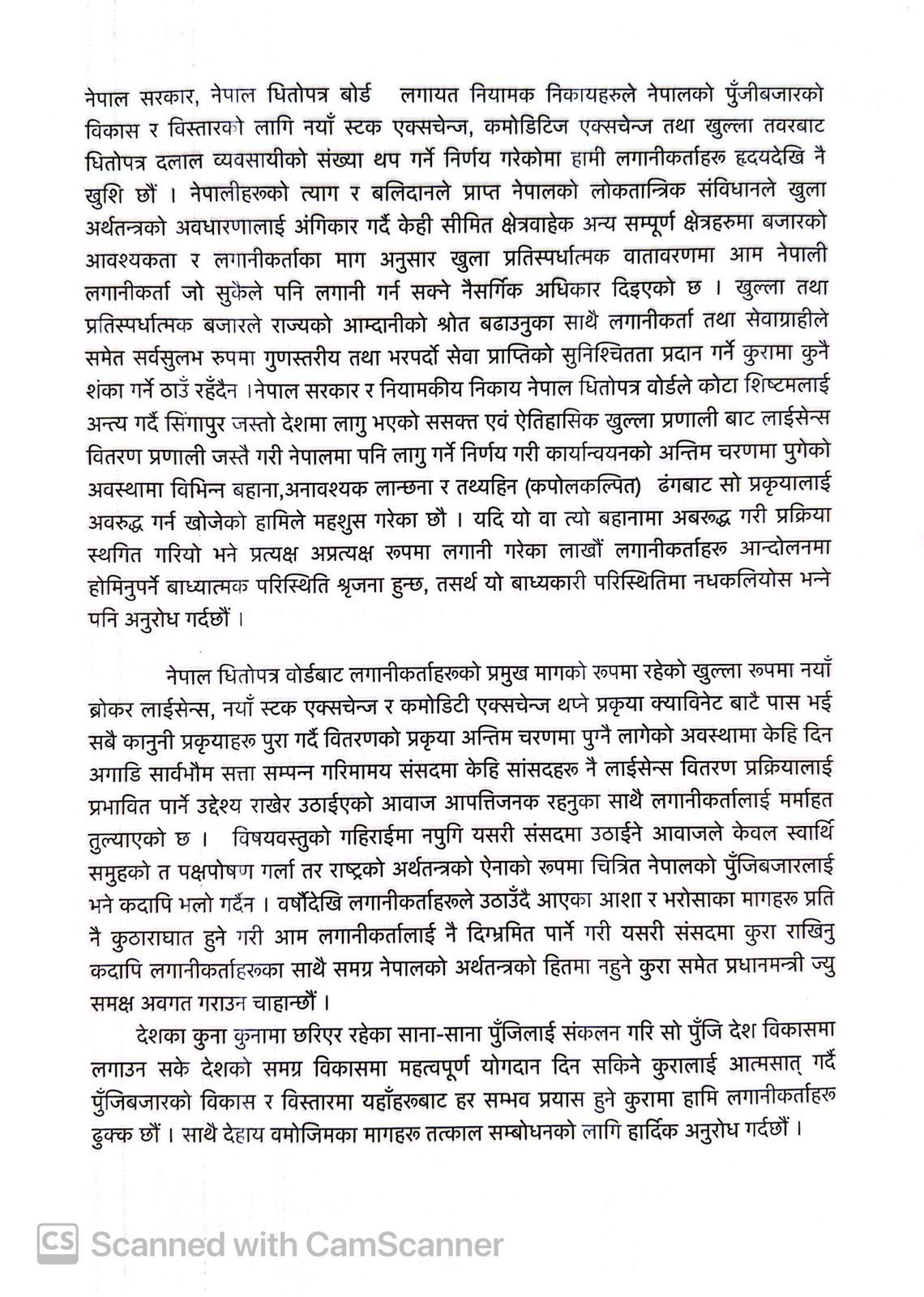 संसदमा नयाँ स्टक एक्सचेन्ज र नयाँ ब्रोकर लाइसेन्सका विषयमा चर्को विरोध भए पछि लगानीकर्ताहरु सत्ता पक्ष र विपक्षका नेताहरुलाई तारन्तार भेटिरहेका छन् । उनिहरुले संसद तथा उच्च स्तरका नेताहरुलाई नयाँ स्टक एक्सचेन्जको प्रकृयाँ नरोकी अगाडी बढाउन समेत अनुरोध गर्दै आएका छन् । अर्थसमितिले समेत नेपाल धितोपत्र बोर्डलाई नयाँ स्टक एक्सचेन्ज तथा पूँजी बजार सुधारका विषयमा भएका सुधारको कामको अवस्था जानकारी गराउन निर्देशन दिइसकेको छ ।