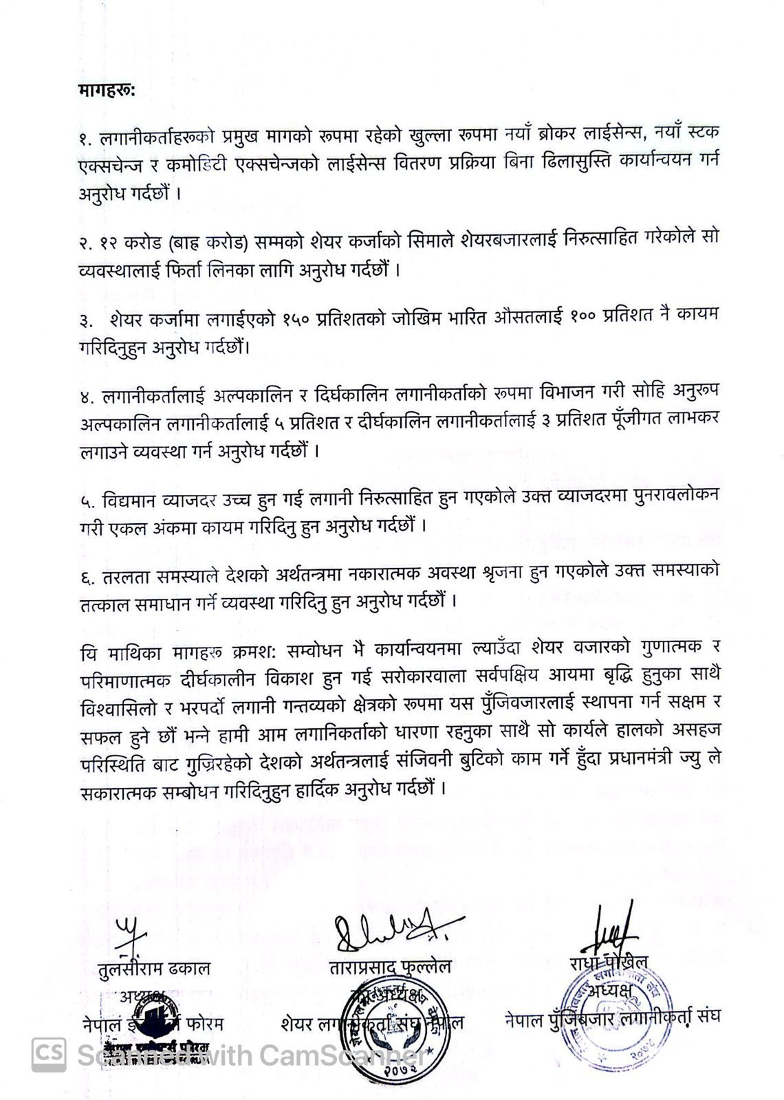 शेयर कर्जामा लगाईएको १५० प्रतिशतको जोखिम भारित औषतलाई १०० प्रतिशत नै कायम गरिदिन समेत अनुरोध गरेका छन् । लगानीकर्तालाई अल्पकालिन र दीर्घकालिन लगानीकर्ताको रुपमा विभाजन गरी सोही अनुरुप अल्पकालिन लगानीकर्तालाई ५ प्रतिशत र दीर्घकालिन लगानीकर्तालाई ३ प्रतिशत पूँजीगत लाभकर लगाउने व्यवस्था गर्न अनुरोध गरेका छन् ।