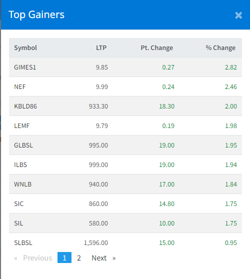 त्यस्तै अन्य कम्पनीहरु क्रमश इन्फिनिटी लघुवित्ती १.९४ प्रतिशत, विन नेपाल लघुवित्त, सगरमाथा इन्स्योरेन्स, सिद्धार्थ इनस्योरेन्स, सामुदायिक लघुवित्त वित्तीय संस्था, साधना लघुवित्त, सामलिङ पावर, युनाइटेड इदि मर्दी, पञ्चकन्या माई, कालिका पावर, समता घरेलु, छिमेक लघुवित्त र हिमालयन बैंकको शेयर मूल्य बढेको छ ।
