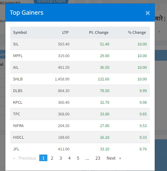 काठमाडौं । मंगलबार नेप्से सूचक ५९.८७ अंकले सुधार हुँदा ९ कम्पनीको शेयर मूल्यमा सकारात्मक सर्किट लागेको छ । पुरै १० प्रतिशतले सुधार हुनेमा सिद्धार्थ इन्स्योरेन्स, मल्टिपर्पस फाइनान्स, अजोड इन्स्योरेन्स, शिर्जनशिल लघुवित्त, धौलागिरी लघुवित्त, कालिका पावर, तेह्रथुम पावर, निफ्रा र एचआइडिसिएल छन् ।