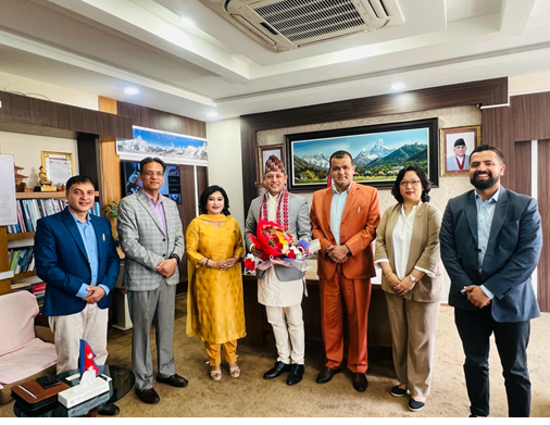 काठमाडौं । नवनियुक्त श्रम मन्त्री डोल प्रसाद अर्याललाई शुकामना तथा बधाई दिन मन्त्रालयमा पुगेको नेपाल उद्योग वाणिज्य महासंघका उपाध्यक्ष तथा रोजगारदाता परिषदका सभापती ज्योत्सना श्रेष्ठ सहितको टोलीले भेटी शुभकामना तथा बधाई दिएका छन् ।