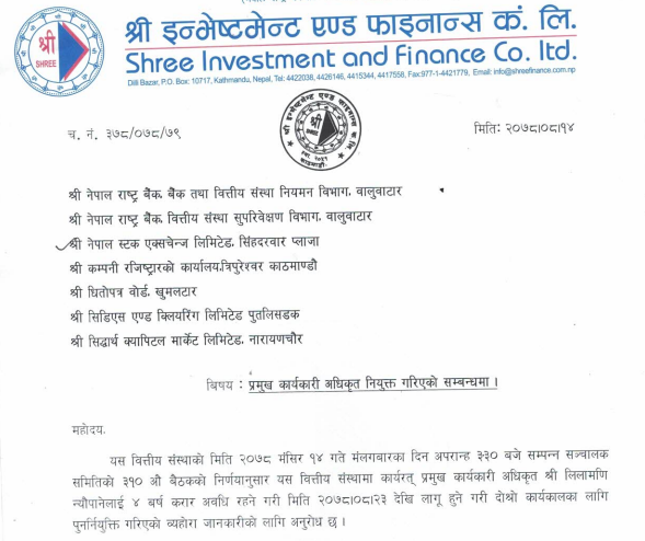 काठमाडौं । श्री इन्भेष्टमेन्ट एण्ड फाइनान्स कम्पनी लिमिटेडको प्रमुख कार्यकारी अधिकृतमा लिलामणि न्यौपाने पुनः दोहोरिएका छन् । कम्पनीको मंसिर १४ गतेको सञ्चालक समितिको बैठकले न्यौपानेलाई नै दोस्रो कार्यकालाका लागि पुनः नियुक्त गर्ने निर्णय गरेको हो ।
