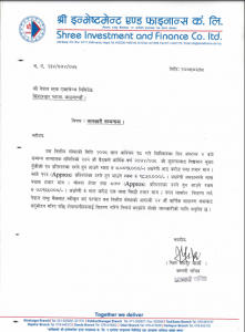 श्री इन्भेष्टमेन्ट एण्ड फाईनान्स कम्पनीले वोनस सेयर र नगद लाभांश दिने भएको छ । कम्पनीले असोज १८ गते बसेको सञ्चालक समितिको २७२ औँ बैठक बाट चुक्ता पूँजीको १० प्रतिशतका दरले हुन आउने ८ करोड १५ हजार मध्ये १ दशमलव २३ प्रतिशत वोनस र ८ दशमलव ७७ प्रतिशत नगद लाभांश दिने भएको छ ।