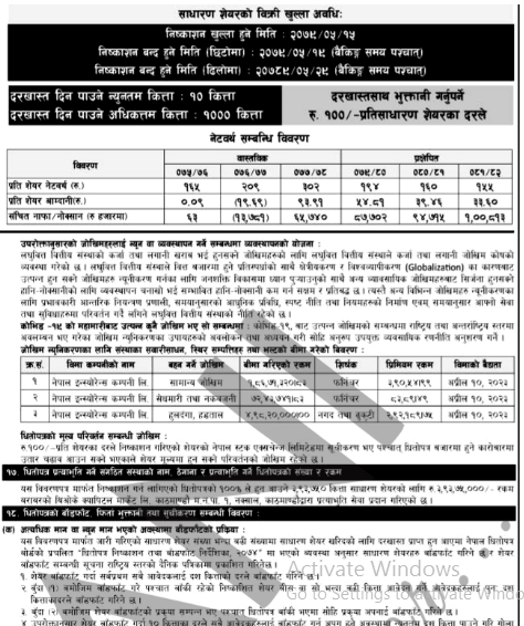 उक्त आइपीओमा भदौ १९ गतेसम्म आवेदन दिन सकिनेछ । उक्त अवधिमा माग बमोजिम आवेदन नपरेमा भदौ २९ गतेसम्म थप हुनेछ । लगानीकर्ताले न्यूनतम १० कित्तादेखि १ हजार कित्तासम्मका लागि आवेदन दिन सक्नेछन् ।