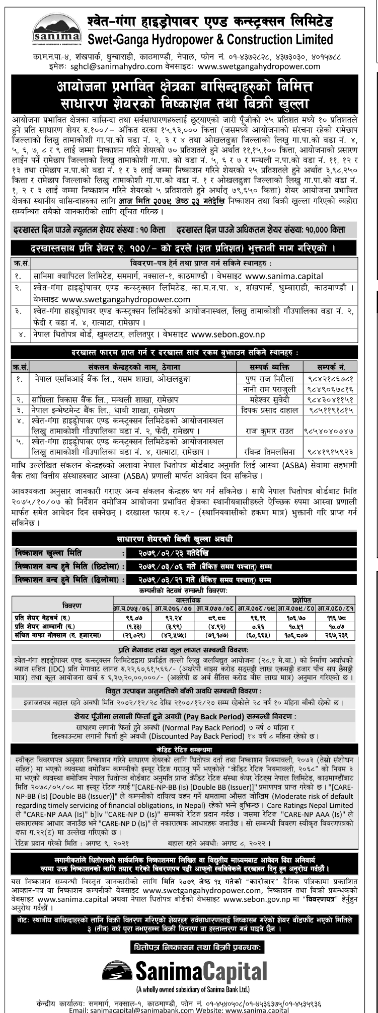 काठमाडौं । श्वेत गंगा हाइड्रोपावर एण्ड कन्स्ट्रक्सन लिमिटेडले आजदेखि आइपीओ निष्काशन तथा विक्री खुला गरेको छ । कम्पनीले पहिलो चरणमा आयोजना प्रभावित क्षेत्रका स्थानीय वासिन्दाहरूका लागि आइपीओ निष्काशन गर्न लागेको हो । कम्पनीले पहिलो चरणमा जारी पूँजी १ अर्ब ५९ करोड ३० लाखको १० प्रतिशतले हुन आउने प्रतिशेयर १०० अंकित दरको १५ लाख ९३ हजार कित्ता शेयर स्थानीयमा विक्री गर्न लागेको हो ।