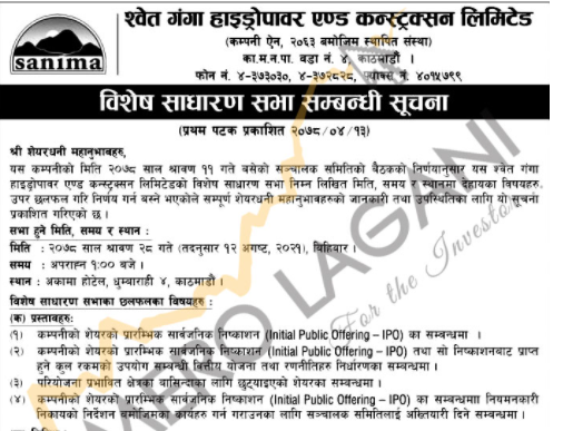 कम्पनीको साउन ११ गते बसेको सञ्चालक समितिको बैठकले उक्त सभा गर्ने निर्णय गरेको हो । सभाको विशेष प्रस्तावमा आईपीओ निष्काशन गर्ने प्रस्ताव रहेको छ ।