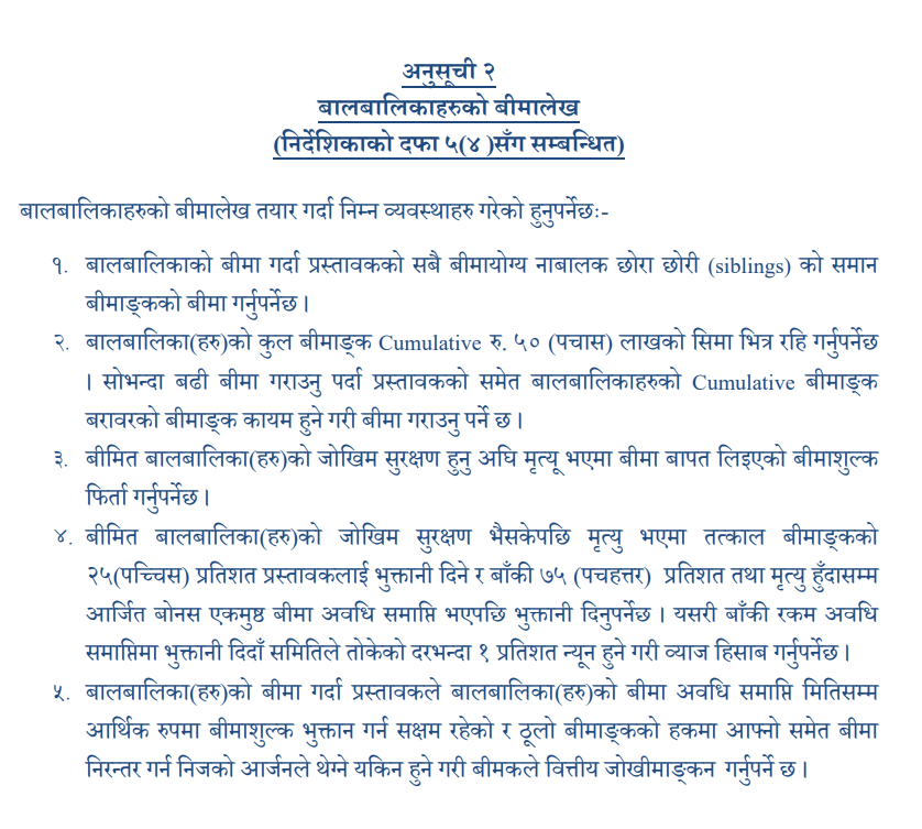 बीमा समितिले २३ असार २०७८ बाट कार्यान्वयनमा ल्याएको ‘जीवन बीमालेख सम्बन्धी निर्देशिका २०७८’ ले बालबालिकाको जीवन बीमा सम्बन्धमा विशेष व्यवस्था गरेको छ । अन्य सावधिक जीवन बीमा योजनाहरुभन्दा फरक । नयाँ व्यवस्था अनुसार बीमा जोखिम प्रारम्भ भएपछि बीमित बच्चाको निधन भएको अवस्थामा बीमांकको २५ प्रतिशत तत्कालै र बीमा अवधि पुरा भएपछि मात्र बाँकी बीमांक(७५ प्रतिशत) र बोनश रकम भुक्तानी हुने प्रावधान रहेको छ ।