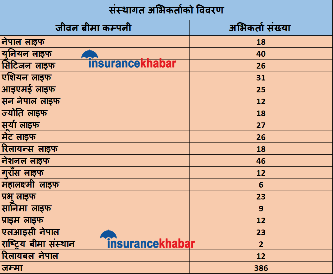 बीमा समितिका अनुसार १९ वटै बीमा कम्पनीका संस्थागत अभिकर्ता छन् । सबैभन्दा धेरै संस्थागत अभिकर्ता नेशनल लाइफ इन्स्योरेन्स कम्पनीको रहेको छ । नेशनलको ४६ वटा संस्थागत अभिकर्ताले नविकरण गरेका छन् । दोस्रो धेरै युनियन लाइफको ४० वटाले नविकरण गरेका छन् ।
