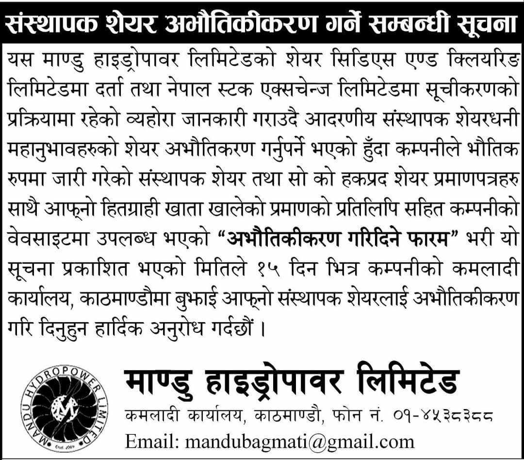 काठमाडौं । माण्डू हाइड्रोपावरले संस्थापक शेयर अभौतिकीकरण गर्न आग्रह गरेको छ । कम्पनीको शेयर सिडिएस एण्ड क्लियरिङ लिमिटेडमा दर्ता तथा नेप्सेमा सूचिकरणको प्रक्रियामा रहेको हुँदा सबै संस्थापक शेयरधनीहरुले शेयर अभौतिकीकरण गर्न आग्रह गरेको हो । शेयर अभौतिकीकरण गर्दा कम्पनीले भौतिक रुपमा जारी गरेको संस्थापक शेयर तथा सोको हकप्रद प्रमाणपत्र साथै आफ्नो हितग्राही खाता खोलेको प्रमाणपत्रको प्रतिलिपी सहित कम्पनीको वेवसाइटमा उपलब्ध गराइएको फारम भरी सूचना प्रकाशित भएको मितिले १५ दिनभित्र कम्पनीको कार्यालयमा बुझाउनुपर्नेछ ।