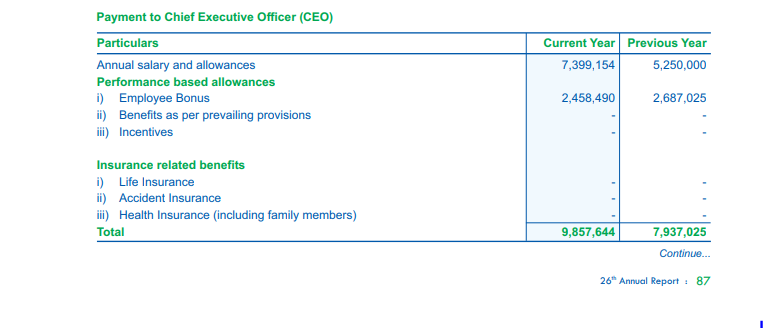 कम्पनीले गत आर्थिक वर्षमा सञ्चालक समितिका पदाधिकारीहरुलाई बैठक भत्ता सुविधा बापत २१ लाख १४ हजार रुपैयाँ उपलब्ध गराएको छ । शेयरधनीहरुको हकमा भने चुक्ता पूँजी एक अर्ब ३३ करोडको १२.४० प्रतिशत बोनस शेयर उपलब्ध गराउदैछ । अर्थात शेयरधनीहरुले १६ करोड ५३ लाख रुपैयाँ बराबरको बोनस शेयर र बोनस शेयरको कर प्रयोजनका लागि ८७ लाख तीन हजार रुपैयाँ नगद लाभांश दिदैछ ।