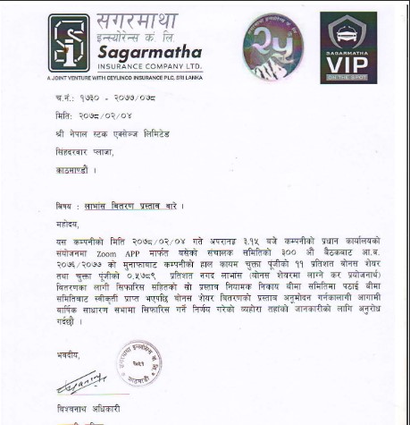 प्रस्तावित बोनस तथा नगद लाभांश नियामक निकाय बीमा समिति र आगामी वार्षिक साधारण सभाबाट पारित भएपछि मात्र वितरण हुनेछ ।