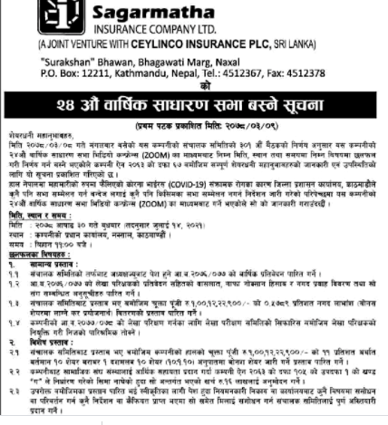 काठमाडौं । सगरमाथा इन्स्योरेन्स कम्पनीको २४औं वार्षिक साधारण सभा आज असार ३० गते हुने भएको छ । कम्पनीको असार ८ गते बसेको सञ्चालक समितिको बैठकले उक्त सभाको मिति तय गरेको हो । सभा प्रधान कार्यालय, नक्साल, काठमाडौंमा बिहान ११ बजे गर्ने कम्पनीले बताएको छ । कोभिड जोखिमलाई मध्यनजर गर्दै सभा भर्चुअल माध्यमबाट गर्ने समेत कम्पनीले जनाएको छ ।