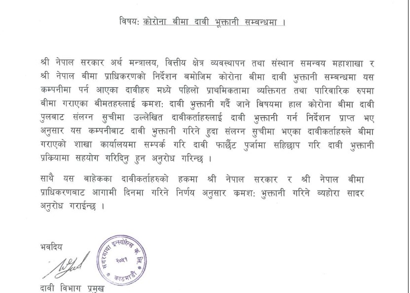कम्पनीले एक सुचना सार्वजनिक गर्दै पिसिआर पोजिटिभ भई बीमा दाबी गर्ने मध्ये पहिलो दाबी गर्नेलाई पहिलो प्राथमिकतामा राखेर दाबी रकमको भुक्तानी शुरु गरिएको जानकारी दिएको छ ।