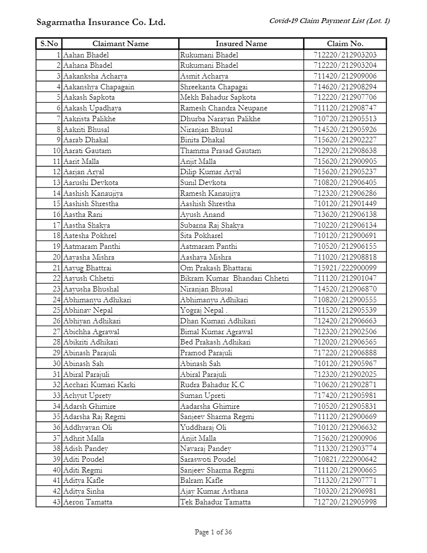 काठमाडौं । सगरमाथा इन्स्योरेन्स कम्पनीले कोरोना बीमा पोलिसी खरिद गरेका आफ्ना बीमितलाई प्राथमिकताको आधारमा दाबी भुक्तानी शुरु गरेको छ ।