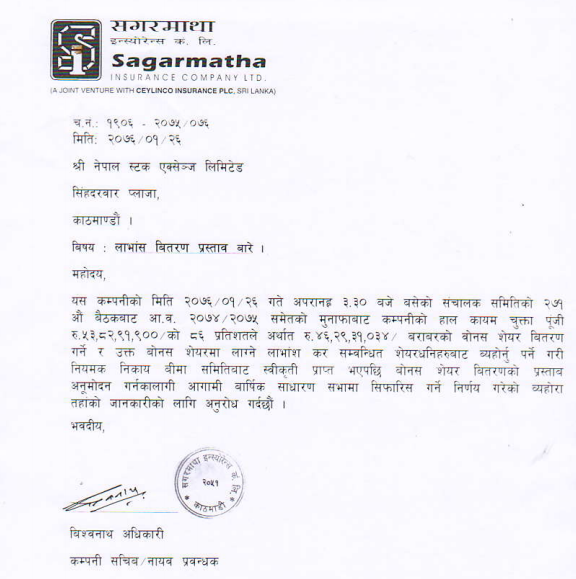 सगरमाथा इन्स्योरेन्सले लाभांश दिने भएको छ । कम्पनीको बैशाख २६ गते बिहिबार बसेको संचालक समितिको २७१ औँ बैठकले आर्थिक वर्ष ७४ ७५को मुनाफाबाट आफ्ना लगानीकर्तालाई ८६ प्रतिशत बोनस शेयर वितरण गर्ने प्रस्ताव गरेको हो ।
