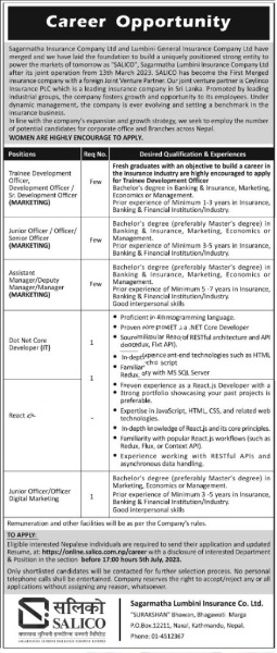 काठमाडौं । सगरमाथा लुम्बिनी इन्स्योरेन्स कम्पनीले विभिन्न पदहरुका लागि कर्मचारी माग गरेको छ । कम्पनीले विभिन्न ६ पदका लागि धेरै संख्यामा कर्मचारी माग गरेको हो । कम्पनीले ट्रेनी डेभलपमेन्ट अफिसर, डेभलपमेन्ट अफिसर र सिनियर डेभलपमेन्ट अफिसरका लागि केही, जुनियर अफिसर, अफिसर र सिनियर अफिसरका लागि केही, असिस्टेन्ट म्यानेजर, डेपुटी म्यानेजर र म्यानेजरका लागि केही, आईटीका लागि २ जना, डिजिटल मार्केटिङमा जुनियर अफिसर र अफिसरका लागि केही संख्यामा कर्मचारी माग गरेको हो ।