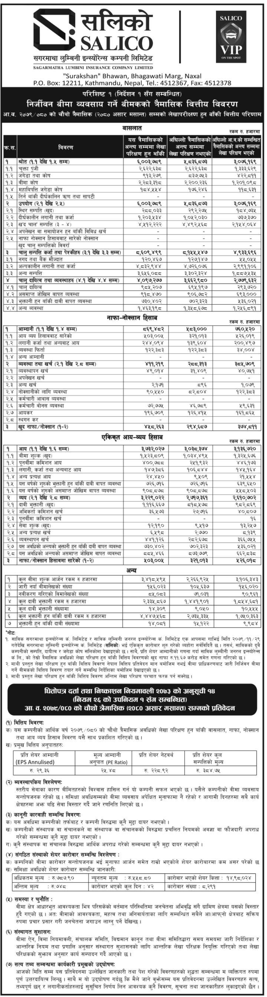 काठमाडौं ।  सगरमाथा लुम्बिनी इन्स्योरेन्स कम्पनीले गत आर्थिक वर्ष (२०७९/८०) को चौथो त्रैमासिक वित्तिय विवरण सार्वजनिक गरेको छ । कम्पनीले सार्वजनिक गरेको अपरिष्कृत वित्तीय विवरण अनुसार कम्पनीको खुद नाफा २२ दशमलव २७ प्रतिशतले वृद्धि भएको छ । गत आर्थिक वर्षको असार मसान्तसम्म कम्पनीले ४५ करोड ८२ लाख रुपैयाँ खुद मुनाफा आर्जन गरेकोमा अघिल्लो आर्थिक वर्षको सोही अवधिमा कम्पनीले ३७ करोड ४८ लाख रुपैयाँ खुद नाफा गरेको थियो ।