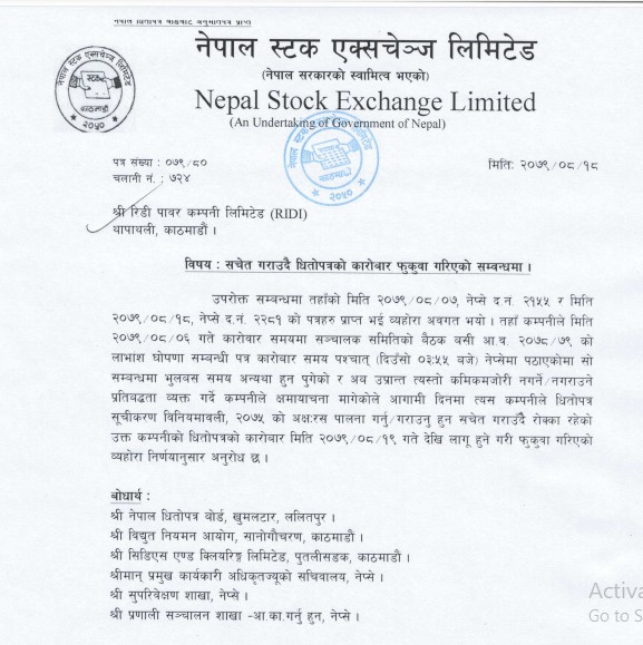 कम्पनीले गत मसिर ६ गते कारोबार समयमा संचालक समितिको बैठक बसी आर्थिक वर्ष २०७८/७९ को लाभांश घोषणा सम्बन्धी पत्र कारोबार समयपश्चात नेप्सेमा पठाएकोमा नेप्सेले कम्पनीको शेयर कारोबार रोक्का गरेको थियो ।