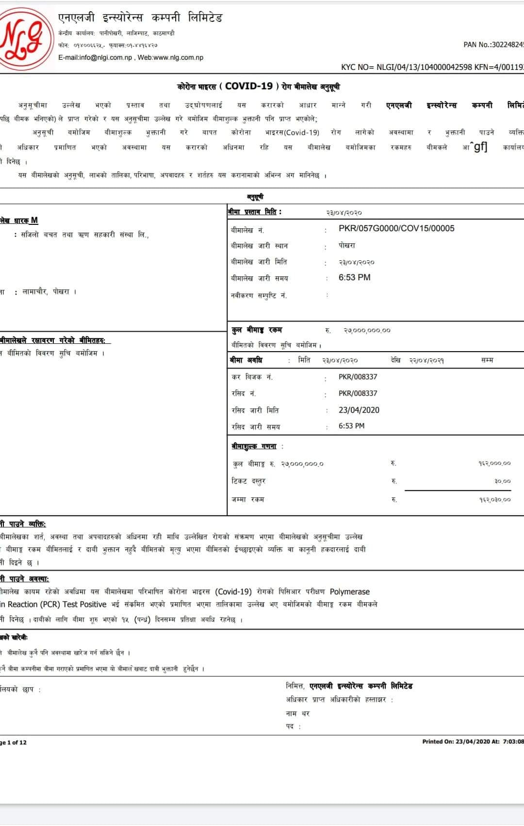 काठमाडौं । पोखरामा रहेको सजिलो बचत तथा ऋण सहकारी संस्थाले आफ्ना ५४० जना सदस्यको कोरोना बीमा गराएको छ । एनएलजी इन्स्योरेन्समा सो सहकारीले आफ्ना सबै सदस्यहरुको कोरोना भाइरसको बीमा गराएको हो ।