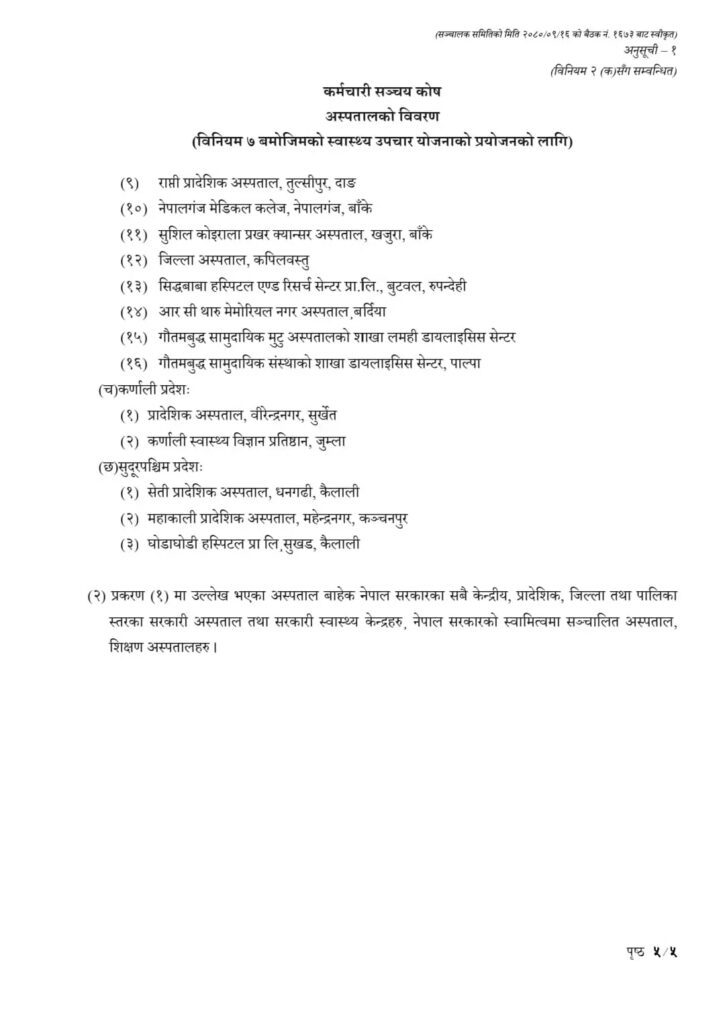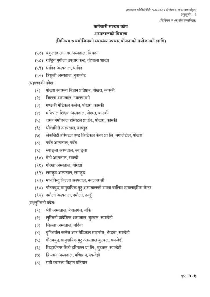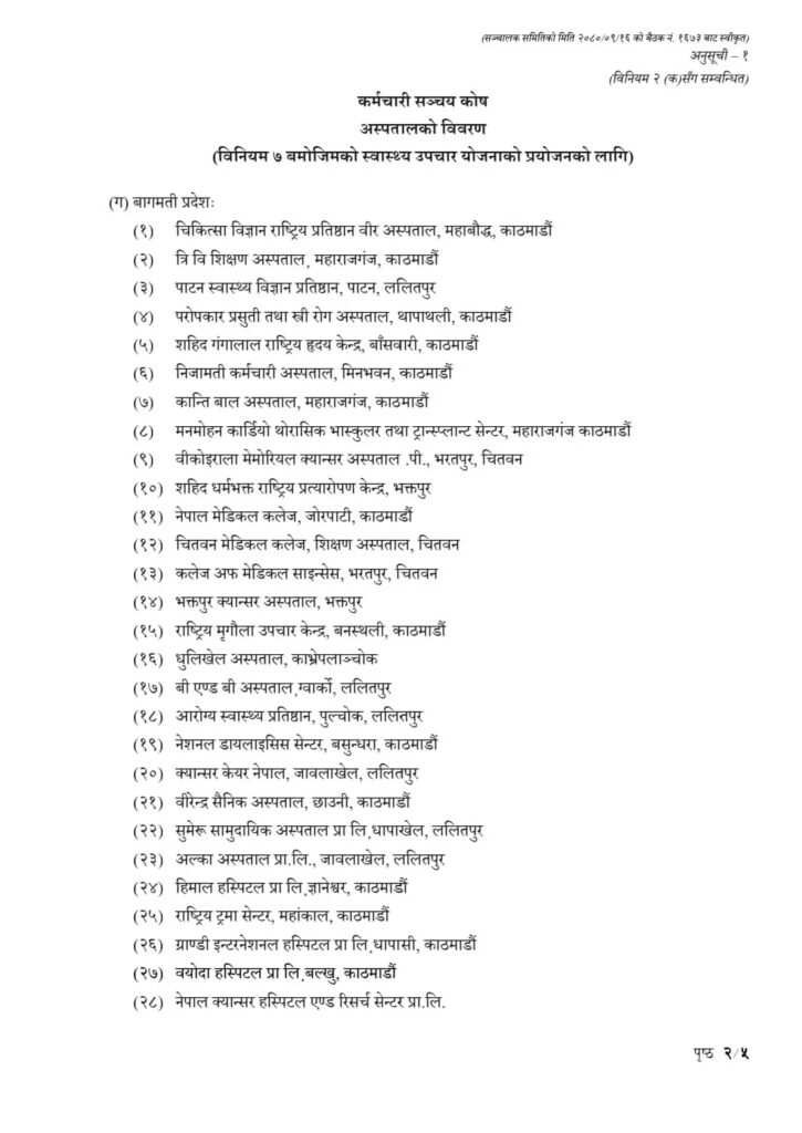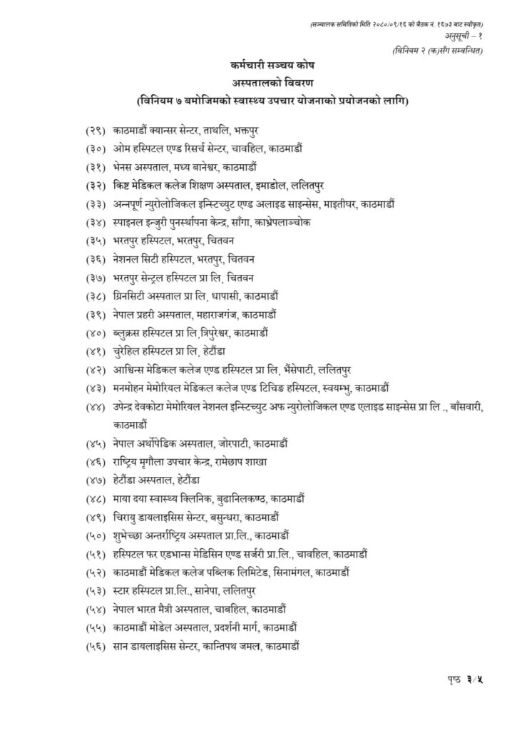 यसैगरी दाबी रकमको दुरुपयोग रोक्न र सञ्चयकर्तालाई नगद रहित उपचार सेवा उपलब्ध गराउने तयारी स्वरुप कोषले सूचीकृत अस्पतालहरुबाट सेवा लिएको अवस्थामा मात्र सुविधा वापतको रकम भुक्तानी गरिने घोषणा गरेको छ। कोषका अनुसार सूचीकृत बाहेकका अस्पताल वा स्वास्थ्य संस्थाबाट उपचार गराएको अवस्थामा कोषबाट उपचार खर्च सुविधावापतको रकम सोधभर्ना दिइने छैन । कोषले सातवटै प्रदेशका सूचीकृत अस्पताल तथा स्वास्थ्य संस्थाहरुको नामावली सार्वजनिक गरेको छ।