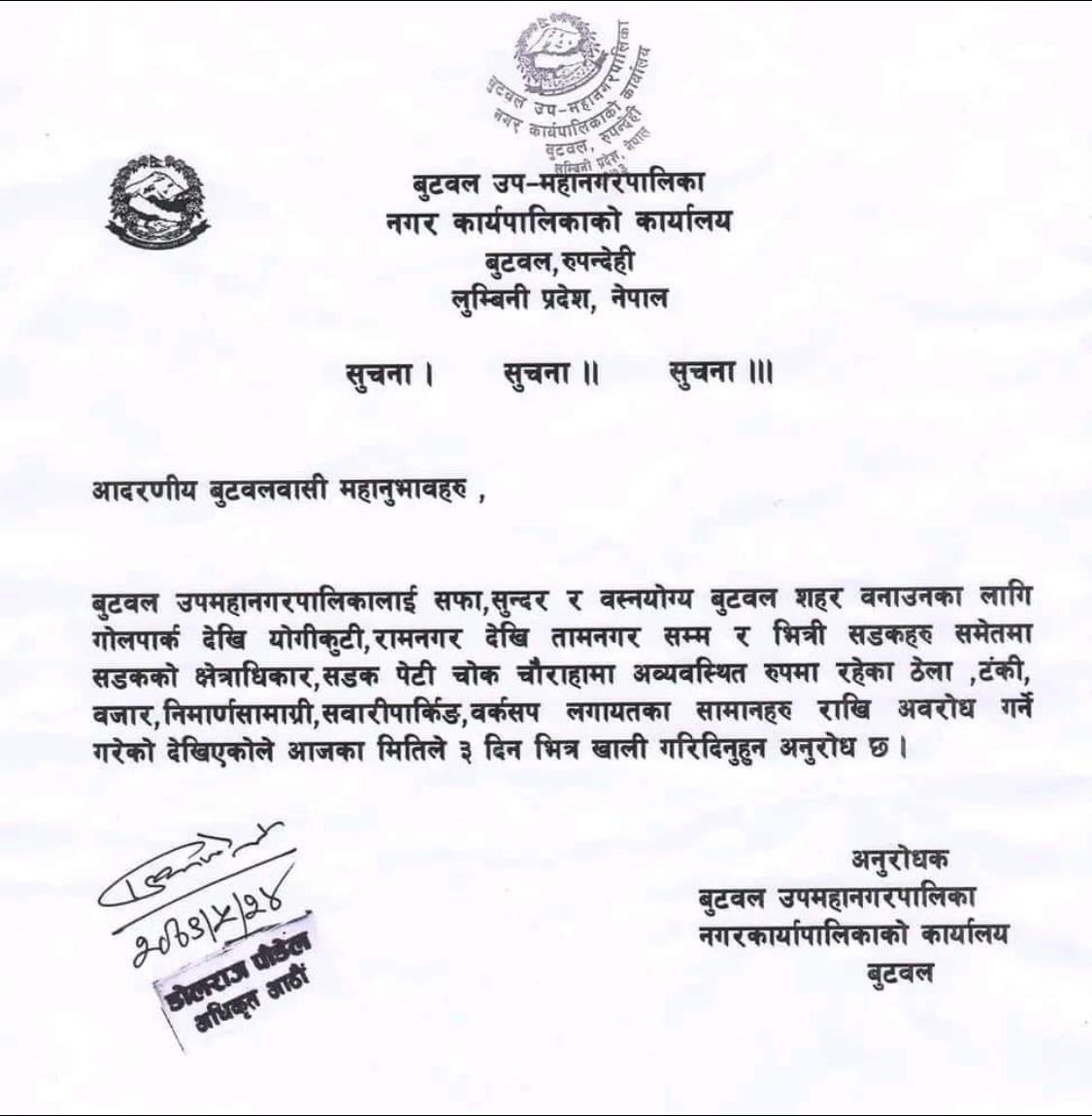 काठमाडौं । बुटवल उप-महानगरपालिकाले सडक पेटी खाली गर्न स्थानीवासीलाई आग्रह गरेको छ । उपमहानगरपालिकाले गोलपार्कदेखि योगीकुटि, रामनगर देखि तामनगरसम्म र भित्री सडकहरु समेतमा सडकको क्षेत्राधिकार, सडक पेटी चोक चौराहमा अव्यवस्थित रुपमा रहेका ठेला, टंकी बजार, निर्माणसामाग्री, सवारीपार्किङ, वर्कसप लगायतका सामानहरु राखी अवरोध गर्ने भएकाले यस्तो समान हटाउन आग्रह गरेको हो ।