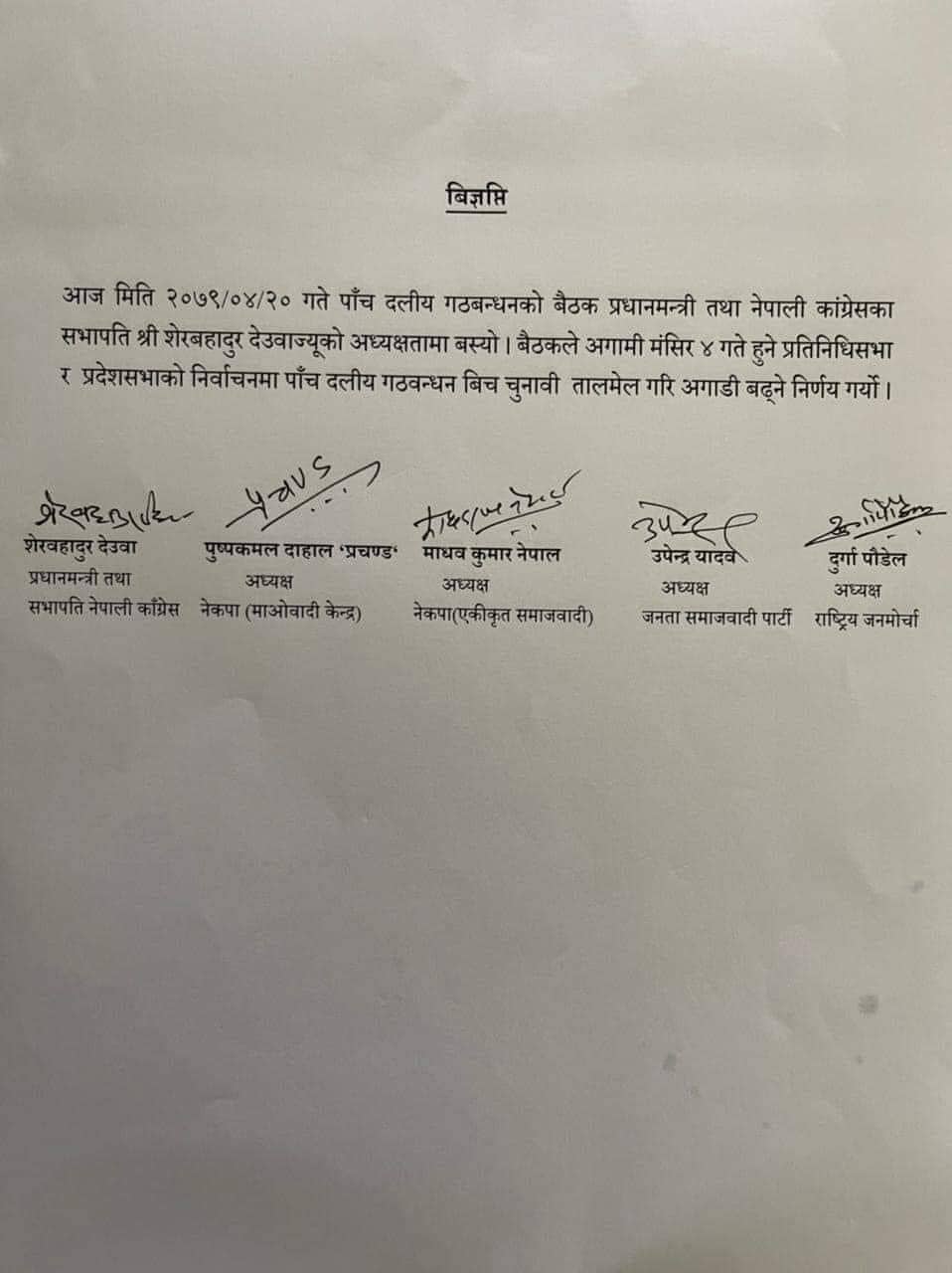 काठमाडौं । सत्तारुढ दलहरुले आगामी निर्वाचनमा दलिय गठबन्धनलाई निरन्तरता दिने सहमति गरेका छन् । सरकारले हिजो मात्रै प्रदेश र प्रतिनिधिसभाको निर्वाचन यहि मंसिर ४ गते गर्ने निर्णय गरेको थियो । निर्वाचनको मिति तय भए सँगै अहिले सत्ता गठबन्धन गरिरहेका ५ दलले चुनावी तालमेलको सहमति पत्रमा हस्ताक्षर गरेका छन् ।