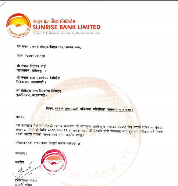 काठमाडौं । सनराइज बैंकले स्वतन्त्र सञ्चालक ओमकृष्ण जाशीको राजिनामा स्वीकृत गरेको छ । बैंकको साउन २२ गते बसेको ३५२ औँ बैंठकले सोही मितिबाट लागु हुने गरी राजिनामा स्वीकत गरेको हो ।
