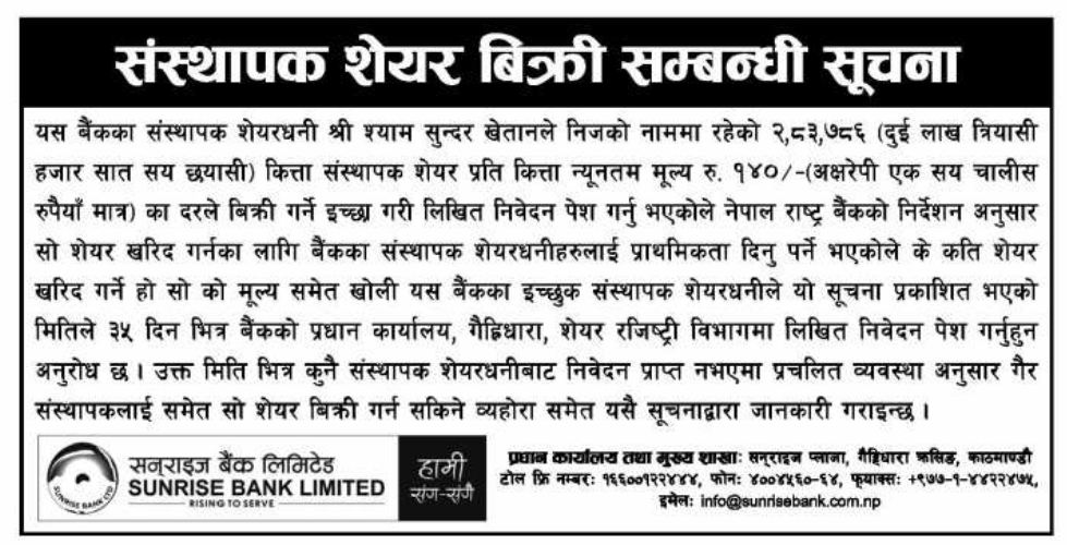 राष्ट्र बैंकको निर्देशन अनुसार संस्थापक शेयर खरिद गर्नका लागि बैंकका संस्थापक शेयरधनीहरुलाई प्राथमिकता दिनुपर्ने भएकोले संस्थापक शेयरधनीहरुले के कति शेयर खरिद गर्ने हो सो खुलाई बैंकका इच्छुक संस्थापक शेयरधनीलाई सूचना प्रकाशन भएको ३५ दिनभित्र आवेदन दिन बैंकले आग्रह गरेको छ ।