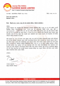 सनराइज बैंक लिमिटेडले सेयरधनीलाई ११.५ प्रतिशत नगद लाभांश दिने भएको छ । बैंकको बिहिबार बसेको सञ्चालक समितिको ३०३ औँ बैठकले यस्तो निर्णय गरेको हो । बैंकले गत आर्थिक वर्षको मुनाफाबाट आफ्ना सेयरधनीलाई कर सहित चुक्ता पुँजीको सो मात्राको सेयर वितरण गर्ने प्रस्ताव गरेको हो ।