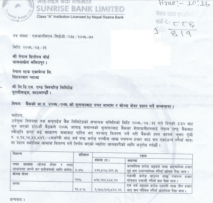 नियामक निकाय नेपाल राष्ट्र बैंक र आगामी साधारण सभाले अनुमोदन गरेपछि लगानीकर्तालाई लाभांश वितरण गर्ने जनाएको छ ।