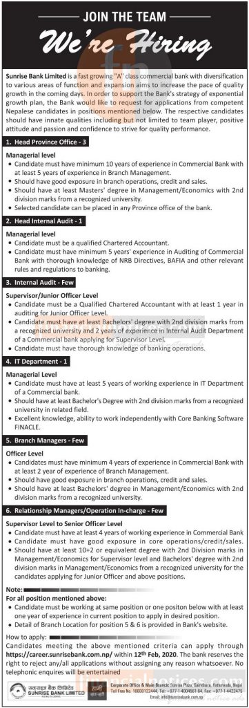 काठमाडौैं । सनराइज बैंकले विभिन्न तहको लागि कर्मचारी माग गरेको छ । बैंकले प्लल टु उर्तीण सहित मध्यम तहको व्यवस्थापनमा कर्मचारीम माग गरेको हो ।