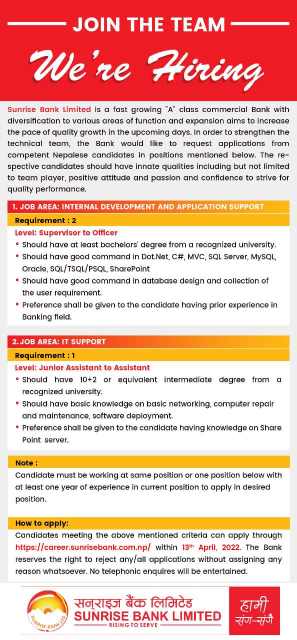 काठमाडौं । सनराइज बैंकले विभिन्न पदका लागि कर्मचारीको माग गरेको छ । कम्पनीले इन्टनल डेभलपमेन्ट एण्ड एप्लिीकेशन सपोर्टका सुपरभाइजर देखि अफिसरसम्मका लागि २ जना, आइटी सपोर्टमा जुनियर असिस्टेन्टदेखि असिस्टेन्टसम्मका लागि १ जना कर्मचारीको माग गरेको हो । कम्पनीले आफ्नो कार्यालय तथा शाखा कार्यालयका लागि कर्मचारीको माग गरेको हो । ईच्छक तथा योग्यता पुगेकाले अप्रिल १३ भित्र आवेदन दिनुपर्नेछ ।