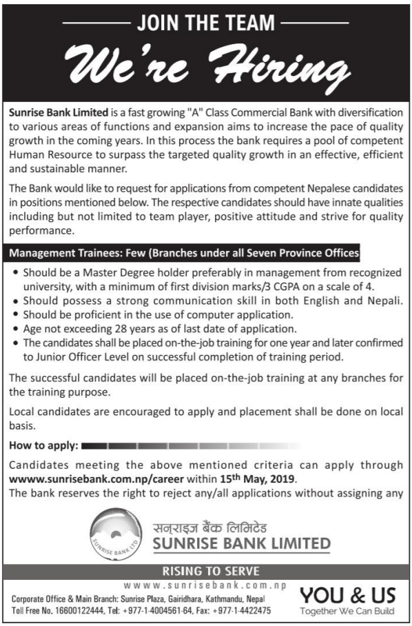 सनराइज बैंकले कर्मचारीको माग गरेको छ । बैंकले म्यानेजमेन्ट ट्रेनीका लागि केही कर्मचारीको माग गरेको छ ।