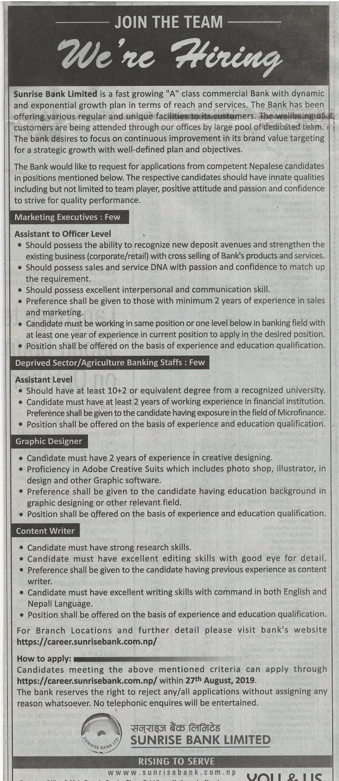 काठमाडौँ । सनराइज बैंकले विभिन्न पदमा कर्मचारी माग गरेको छ । बैंकले मार्केटिङ एक्जुकेटिभ, डिप्राइभड सेक्टर/ अग्रिकल्चर बैंकिङ्ग स्टाफ, ग्राफिक डिजाइनर र कन्टेन्ट राइटर पदमा केही कर्मचारी माग गरेको हो