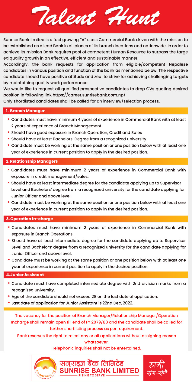 काठमाडौं । सनराइज बैंक लिमिटेडले कर्मचारीको माग गरेको छ । बैंकले ब्रान्च म्यानेजर, रिलेशनसिप म्यानेजर, अप्रेसन म्यानेजर र जुनिएर एसिस्टेन्ट पदमा कर्मचारी माग गरेको छ । उक्त पदहरुमा आवेदन दिनको मान्यता प्राप्त शैक्षिक संस्थाहरुबाट स्नात्तक तह उत्तिर्ण गरेको हुनुपर्ने बैंकले जनाएको हो ।