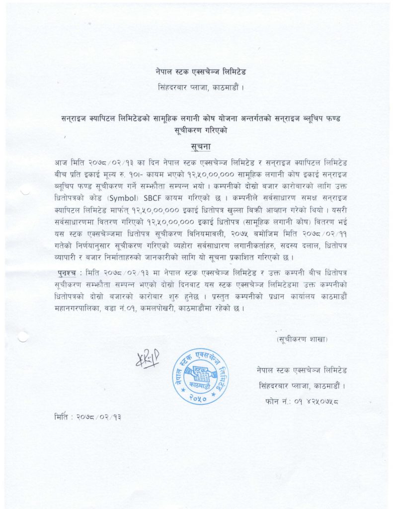क्यापिटलले चैत्र १ गते, आइतबारदेखि चैत्र ८ गते, आईतबारसम्म सनराइज ब्लूचिप फण्ड नामक सामुहिक लगानी कोष बिक्री खुल्ला गरेको थियो ।