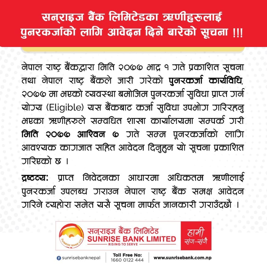 सनराइजले असोज ७ गतेसम्म पुर्नकर्जाका लागि आवश्यक कागजातहरु उपलब्ध गराउन अनुरोध समेत गरेको छ । प्राप्त निवेदनका आधारमा ऋणीहरुलाई पुर्नकर्जा उपलब्ध गराउन नेपाल राष्ट्र बैंकसंग अनुरोध गरिने सनराइजले जानकारी दिएको छ ।