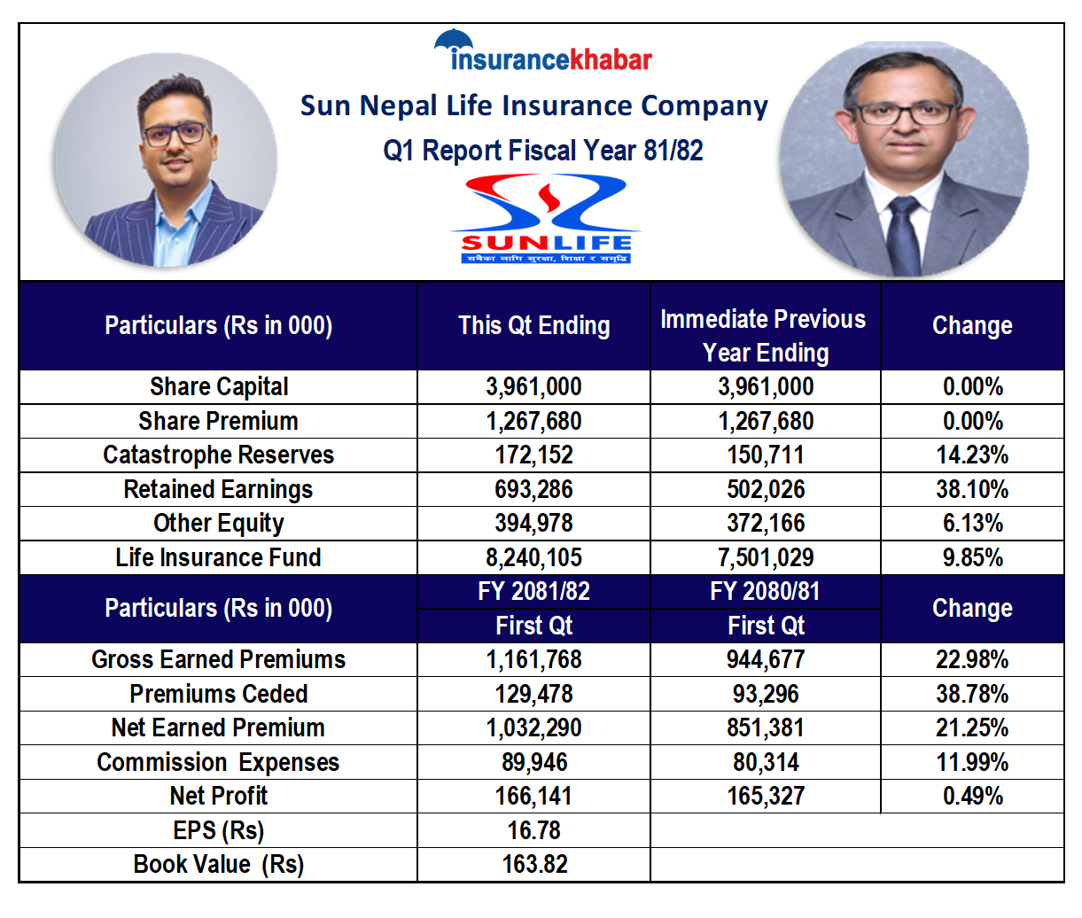 काठमाडौं । सन नेपाल लाइफ इन्स्योरेन्सले चालु आर्थिक वर्ष २०८१।८२को पहिलो त्रैमासको वित्तीय विवरण प्रकाशन गरेको छ।